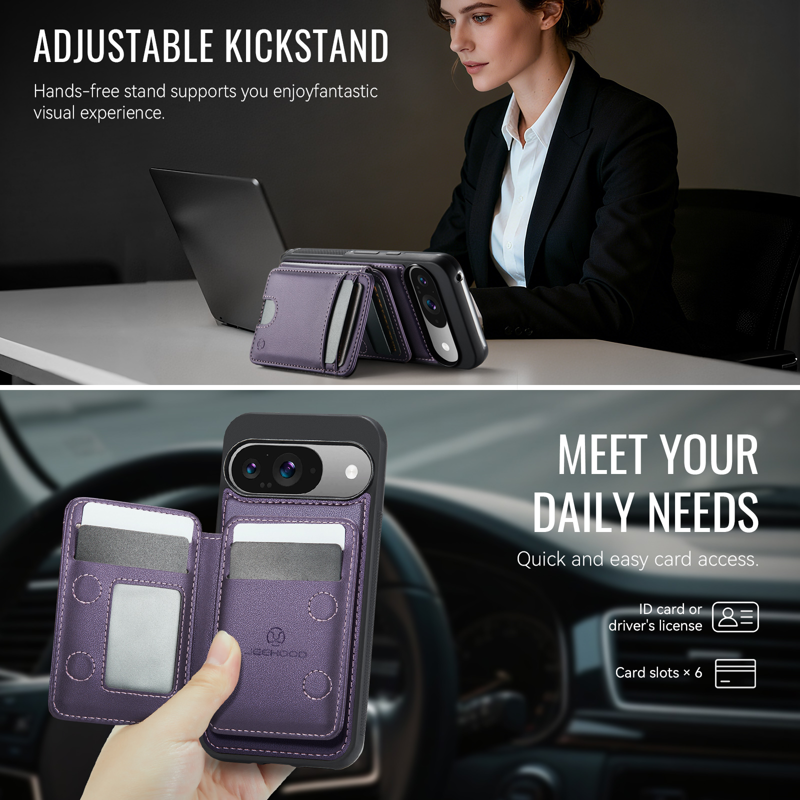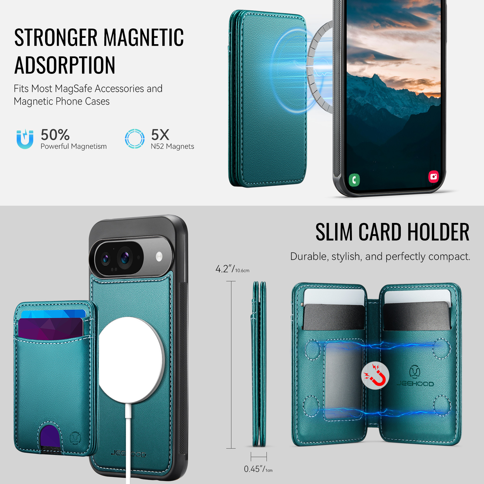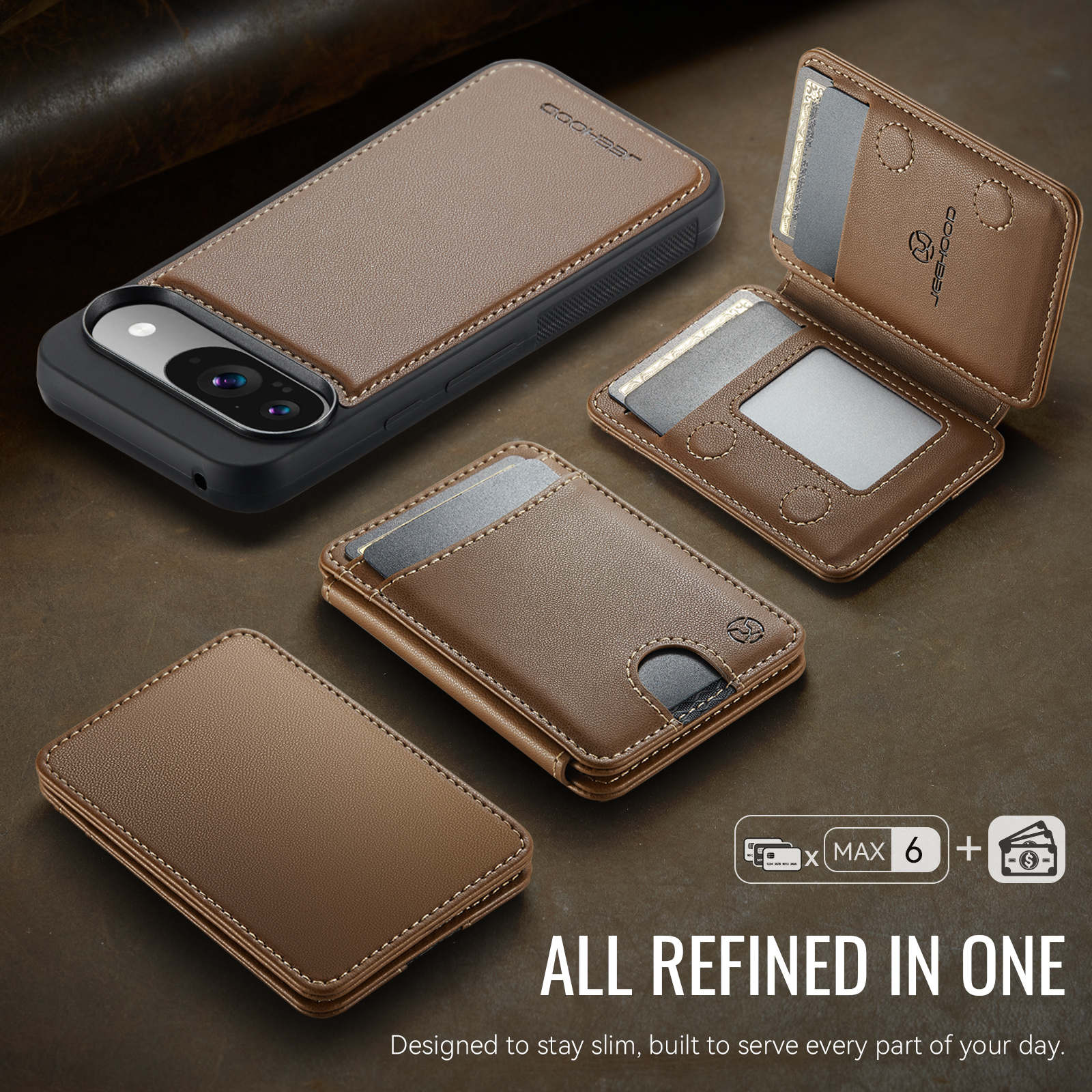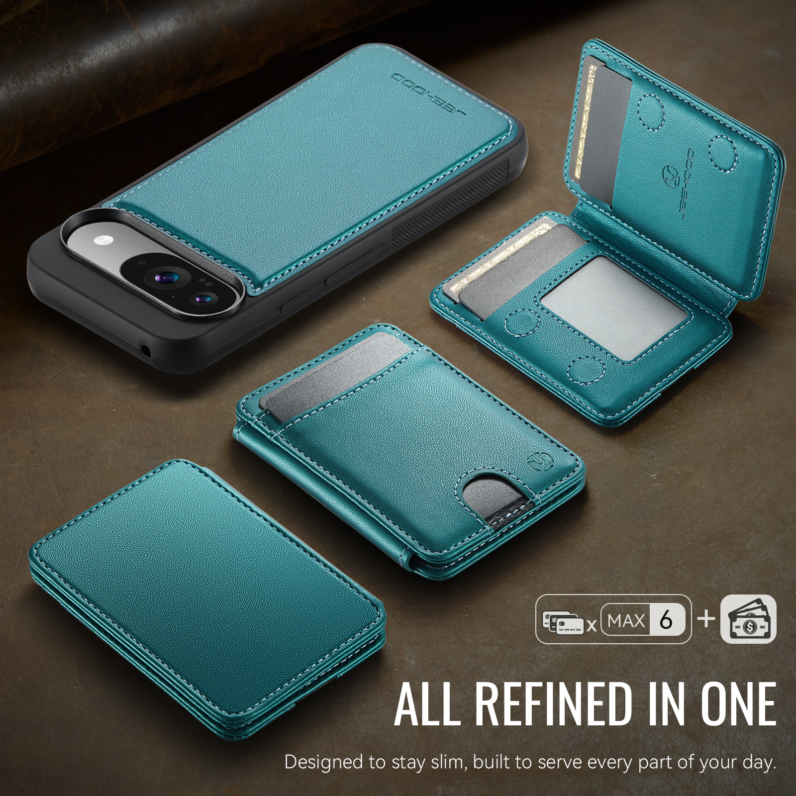 Держатель карт с несколькими отделениями для карт с возможностью открывания слева и справа, благодаря встроенному магниту держится всегда надежно. Держатель для карт оснащён слотом для карт, открывающимся нажатием, слотом для фоторамки и пятью отделениями для карт на передней панели. Слоты для карт оснащены функцией RFID (защита от кражи). Быстрый и удобный доступ к картам.