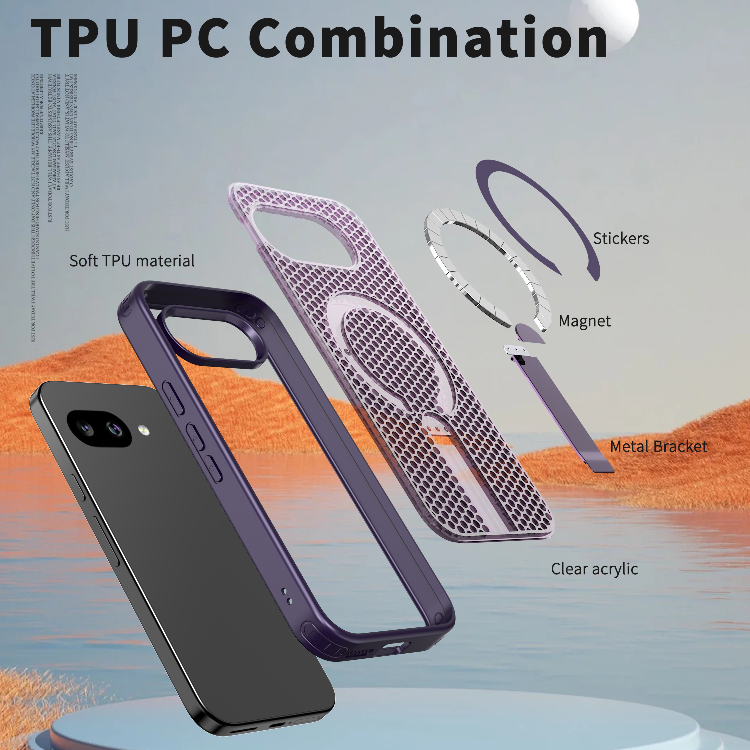 Материал: ТПУ толщина: 2,0 мм + ПК толщина: 3,0 мм + кронштейн из цинкового сплава + магнит.
