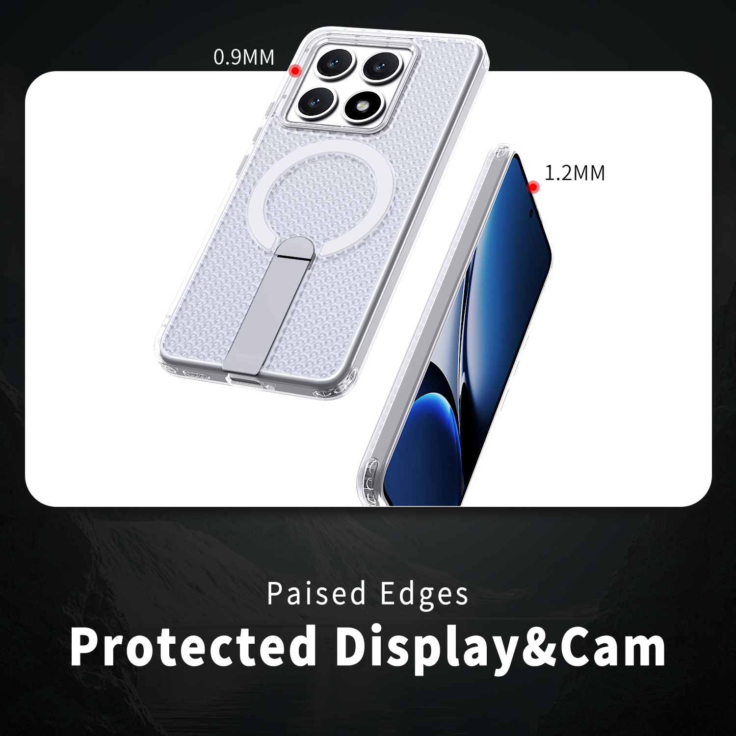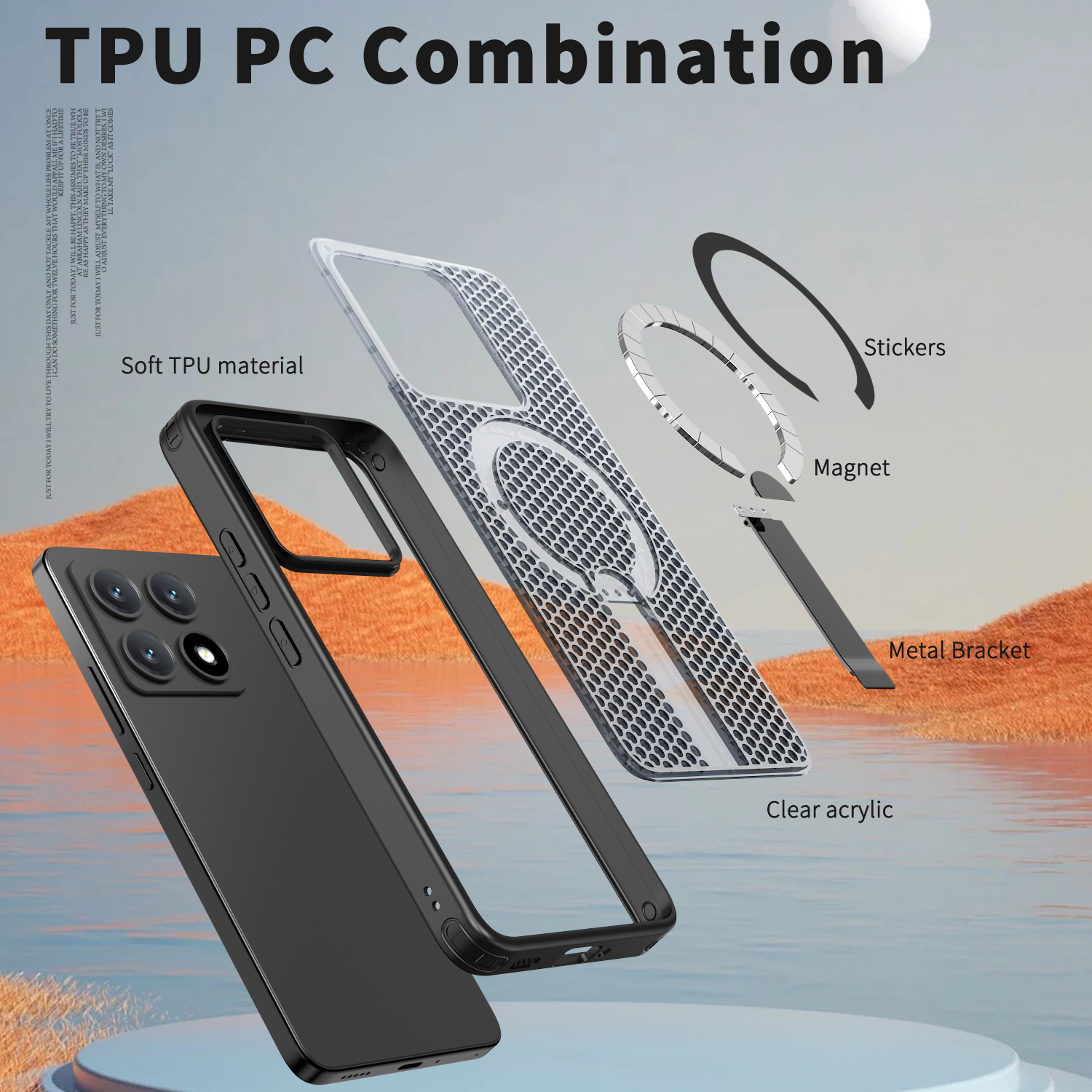 Материал: ТПУ толщина: 2,0 мм + ПК толщина: 3,0 мм + кронштейн из цинкового сплава + магнит.